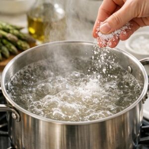 Fill a large pot with cold water, add a generous handful of salt (the water should taste like the sea), and bring it to a rolling boil. The salt is important—this is the only place your pasta gets seasoned, so don’t skip it. Add your pasta and cook according to the package instructions, but check it about a minute before the suggested time. You want it al dente—tender but still with a tiny bit of resistance when you bite it. Fresh pasta and dried pasta have different timing, so follow what your package says.