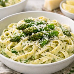 You can, but I’ll be honest: fresh asparagus is significantly better for this recipe. Frozen asparagus releases a lot of water as it thaws, which can waterlog your sauce. If you must use frozen, thaw it completely, pat it very dry with paper towels, and reduce the cooking time to just 2 to 3 minutes. Skip adding extra pasta water initially because the frozen asparagus releases moisture. It won’t be quite as delicious as fresh, but it’ll be perfectly fine, and honestly, this meal is still quicker and cheaper than takeout.