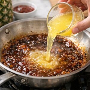 Reduce your stovetop heat to low. The pan is still hot and will retain plenty of heat—this is where the magic happens. Pour about ½ cup of your reserved pineapple juice directly into the hot skillet. You’ll hear a gentle sizzle and see steam rise. Use a wooden spoon to scrape the bottom of the pan, working at those browned, caramelized bits. These are pure flavor, and the juice helps dissolve and incorporate them into your sauce.