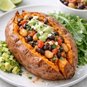 I still remember my grandmother pulling a tray of roasted sweet potatoes from her wood-burning stove on Sunday afternoons, filling our small kitchen with that earthy, caramelized aroma. She’d top them with whatever we had on hand—usually beans from a can, fresh cilantro from her garden, and a dollop of sour cream. That simple meal taught me that nourishing food doesn’t require fancy ingredients or restaurant prices. Today, I’m sharing a modern twist on her wisdom: stuffed sweet potatoes layered with seasoned black beans, fresh vegetables, creamy avocado, and a tangy coconut yogurt drizzle. This dish pairs beautifully with lighter sides like a crisp green salad, or you could make it part of a taco bar with baked chimichangas for a complete meal. It’s the kind of recipe that proves eating well on a budget is absolutely possible—and deeply satisfying.